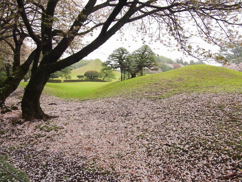 地面を桜の花びらが彩る