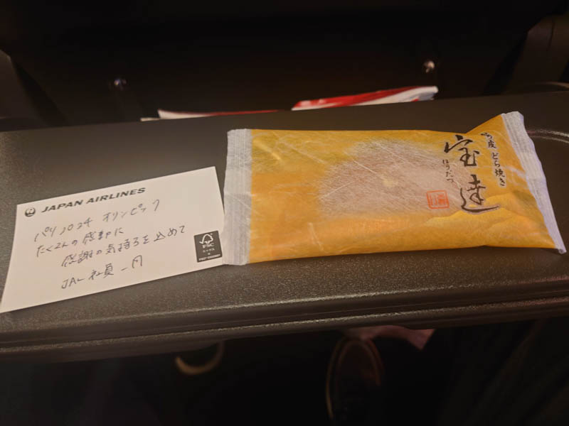 搭乗者にTEAM JAPAN関係者が多いこともあり、このようなメッセージカードが配られた