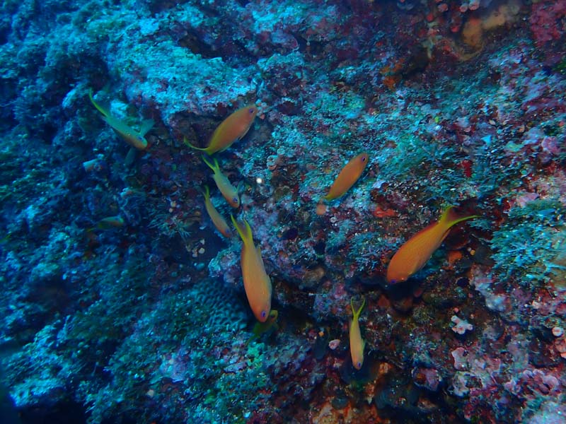 ドロップオフに群れるキンギョハナダイの小さな群れ