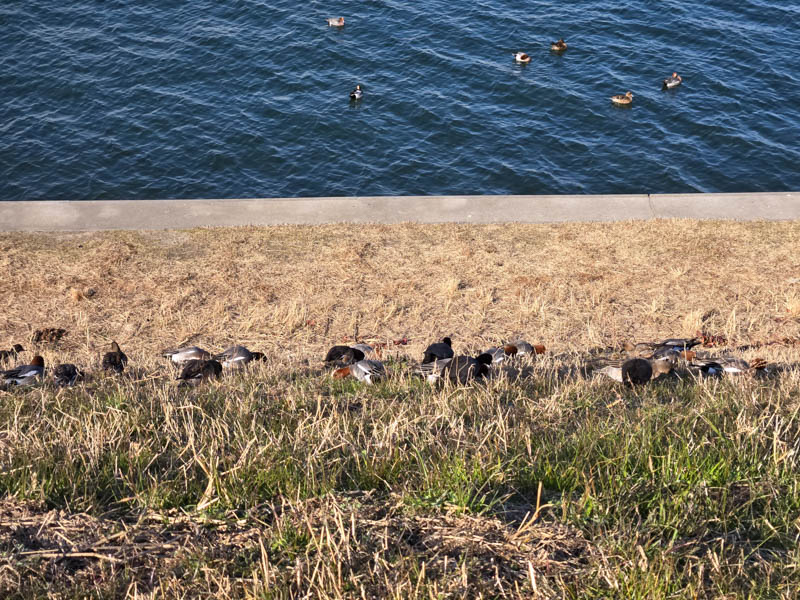 鴨たちが岸に上がっている